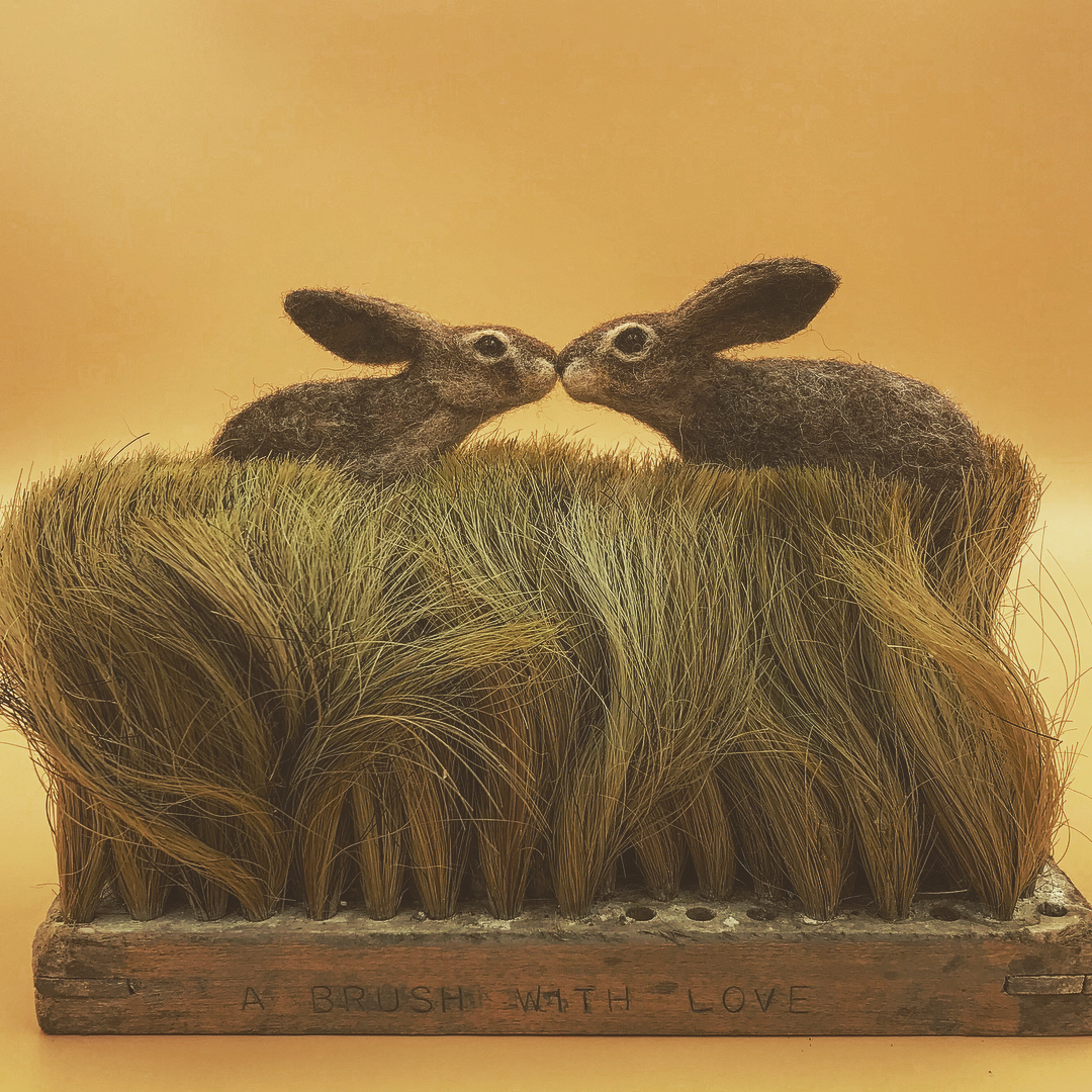Simon Brown is a dreamy artist, a nostalgic poet, and an amused demiurge who gives old objects back their soul by inventing another story. He explains how to recover old brushes, with teeth, shoes or hair, from those to which no one pays any attention anymore, and gives them new life by writing them in rural micro-histories, incorporating animals sewn with wool. In this way, he recreates a narrative in which country dramas are created and unravelled, between danger, exaltation, curiosity and humour. In addition, these materials are recycled or recyclable, recalling the cyclical nature of the materials that make up our daily lives.